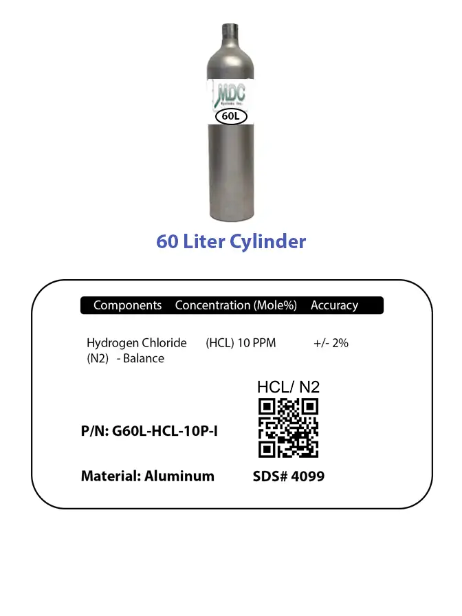 $304.00 60 Liter Hydrogen Chloride (HCL) quantity Add to cart SKU: G60L-HCL-10P-I Category: Gas Cylinders Description Description HCL, 10 ppm in N2 Related products Carbon Monoxide (CO) $109.25 Add to cart Ammonia (NH3) $304.00 Add to cart Methane (CH4) $128.73 Add to cart Silane (SiH4) $304.00 Add to cart