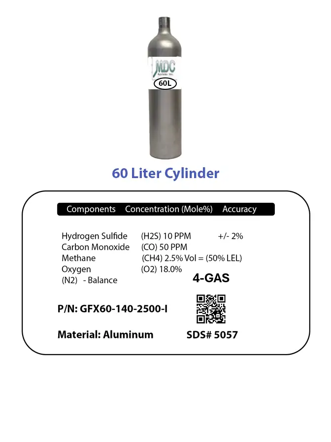 $189.05 60 Liter Hydrogen Sulfide (H2S), Carbon Monoxide (CO), Methane (CH4), Oxygen (O2) quantity Add to cart SKU: GFX60-140-2500-I Category: Gas Cylinders Description Description Hydrogen Sulfide 10 ppm/ Carbon Monoxide 50 ppm/ Methane 2.5% (50% LEL)/ Oxygen 18.0%/ N2 Related products Methane (CH4) $95.00 Add to cart Hydrogen Chloride (HCL) $304.00 Add to cart Hydrogen Chloride (HCL) $304.00 Add to cart Carbon Dioxide (CO2) $109.25 Add to cart